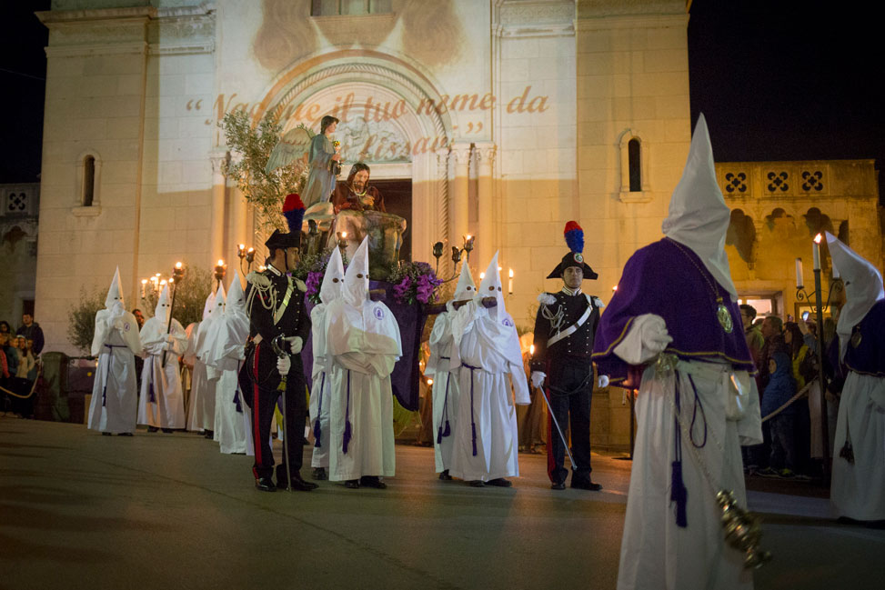 I confratelli indossano il tradizionale saio bianco con mozzetta viola e accompagnano la statua del Cristo Orante in un clima di raccoglimento e silenzio.